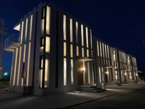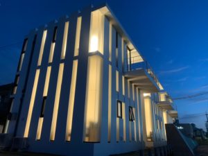 ↓だんだんとサンセットから夜にかわる空に照らされて、青に染まった外観✨