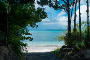 幸福を招く木であるフクギを超えた先に広がる、エメラルドグリーンに輝くサンゴの海は絶景です!